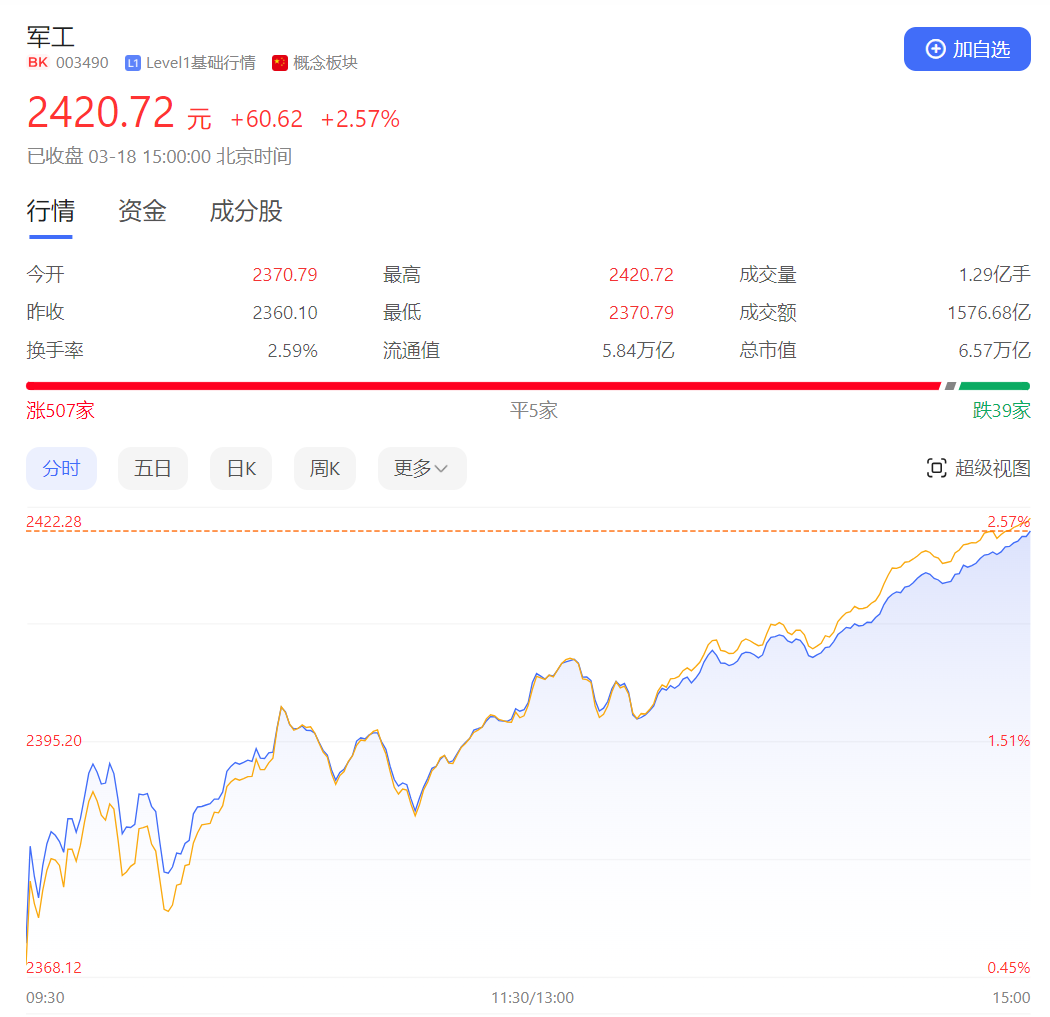 军工股今日也整体走强,国防军工板块指数全天单边上扬,放量涨2.57%。新大洲A、合锻智能均连续3日涨停,泰尔股份、声迅股份、中光学等连续2日涨停。