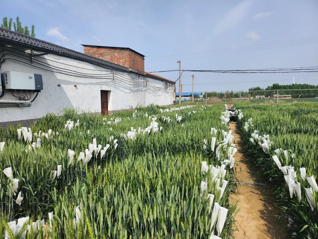 在一片10亩见方的选育田里,一株株麦苗呈小型“方阵”紧密有序排列,各方阵因杂交的父本、母本不同,呈现出高低错落的不同形态。而麦田间,几个头戴草帽的女工手握镊子,正小心翼翼处理着麦穗上的花蕊,在杂交‘手术’后,再套上杂交袋进行专业标记。