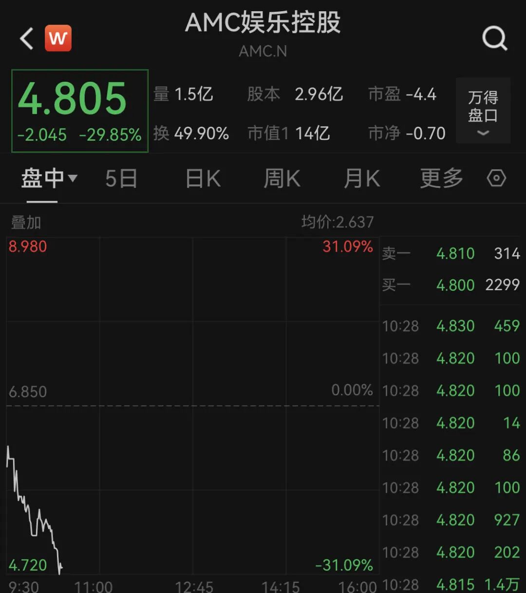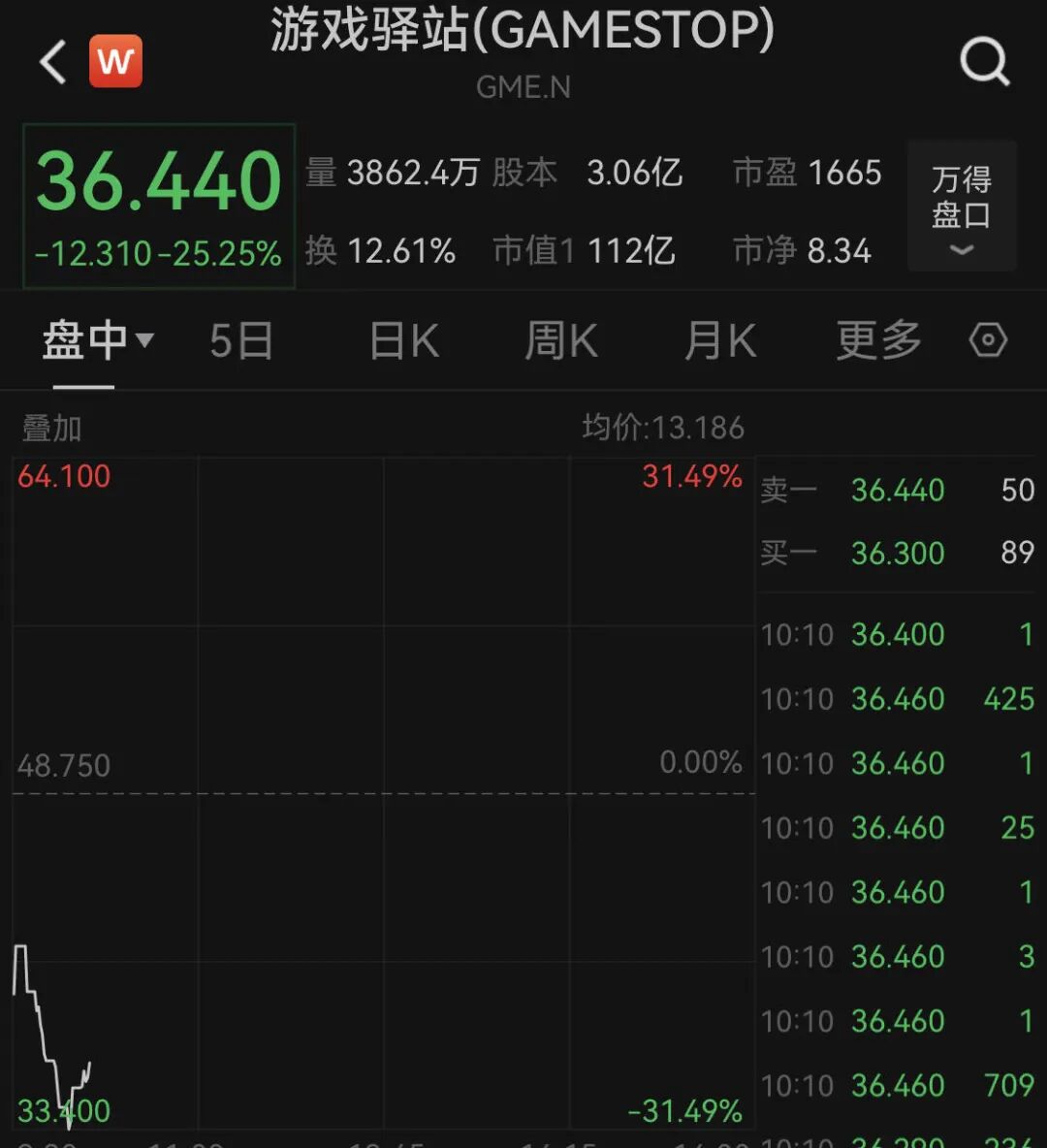 值得注意的是,前两个交易日疯狂上涨的游戏驿站,开盘后就暴跌25%,并触发停牌。而此前大涨的另一只股票AMC娱乐控股跌幅也扩大至26%