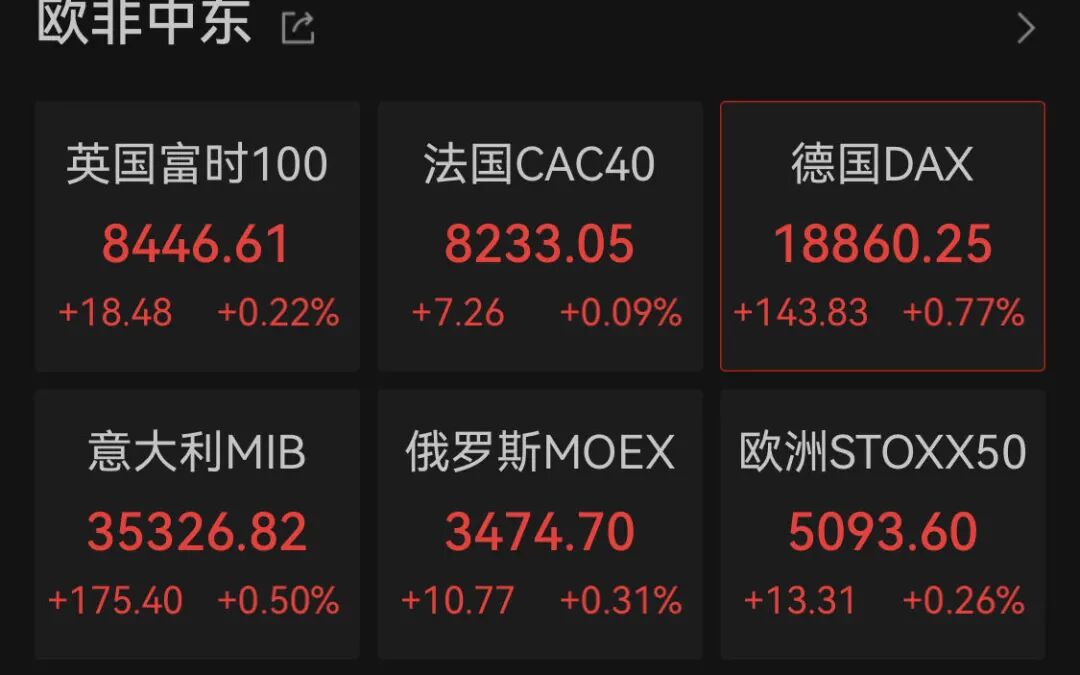 欧洲市场方面,英、法、德等国指数也纷纷走强。