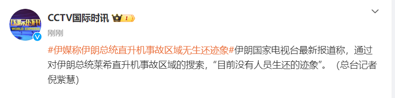 刚刚,伊朗国家电视台最新报道称,通过对伊朗总统莱希直升机事故区域的搜索,“目前没有人员生还的迹象”。