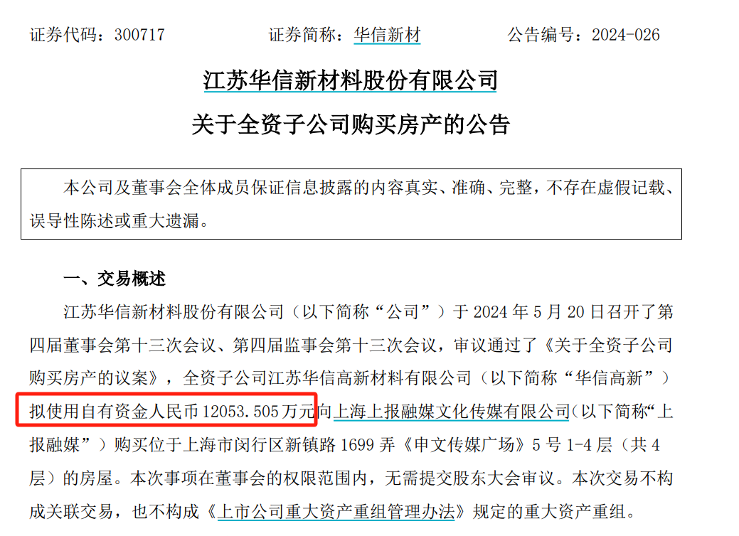 5月20日晚间华信新材(300717)公告,全资子公司江苏华信高新材料有限公司(下称“华信高新”)拟使用自有资金1.21亿元向上海上报融媒文化传媒有限公司(下称“上报融媒”)购买位于上海市闵行区新镇路1699弄《申文传媒广场》5号1-4层(共4层)的房屋。