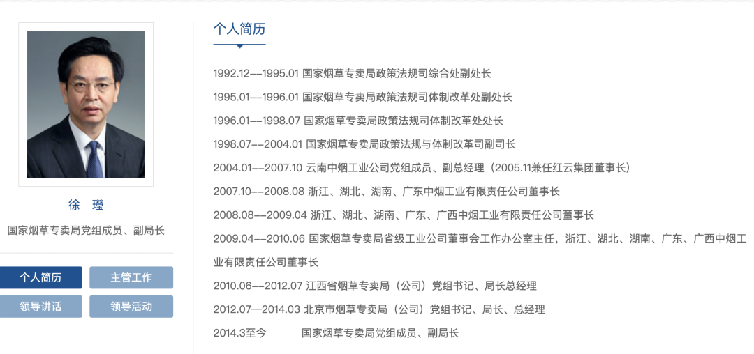 2014年3月,徐㼆开始担任国家烟草专卖局党组成员、副局长。直至此次被查。