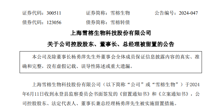 6月11日晚间,雪榕生物公告,公司于2024年6月11日收到永登县监察委员会书面签发的《留置通知书》和《立案通知书》,公司控股股东、法定代表人、董事长兼总经理杨勇萍被实施留置措施。