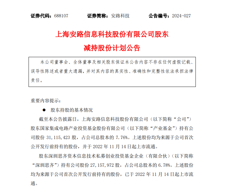 2022年安路科技就曾公告,由于自身资金需求,深圳思齐将根据市场情况拟通过集中竞价或大宗交易方式减持其所持有的上市公司股份合计不超过1400.35万股,拟减持股份数量占公司总股本的比例合计不超过3.5%。