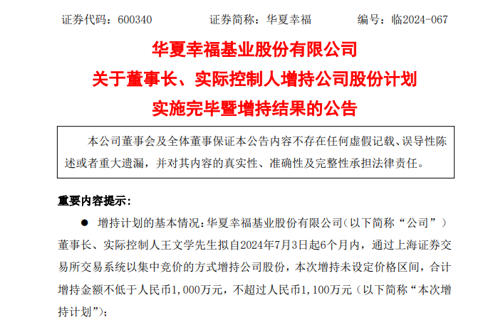 7月3日,华夏幸福曾披露《关于董事长、实际控制人增持公司股份计划的公告》,王文学计划自7月3日起6个月内,通过上海证券交易所交易系统以集中竞价的方式增持公司股份,合计增持金额不低于1000万元,不超过1100万元。
