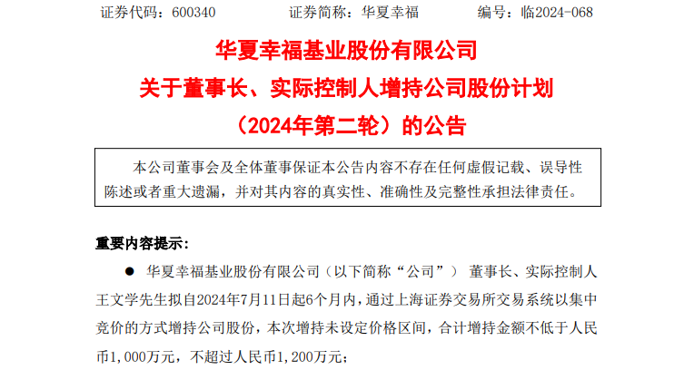 7月10日,华夏幸福发布关于董事长、实际控制人增持公司股份计划(2024年第二轮)的公告,董事长、实际控制人王文学拟自2024年7月11日起6个月内,通过上海证券交易所交易系统以集中竞价的方式增持公司股份,本次增持未设定价格区间,合计增持金额不低于1000万元,不超过1200万元。