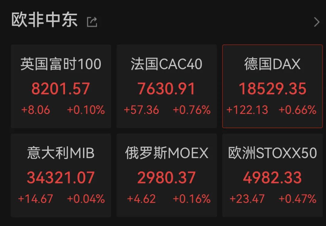 欧洲市场方面,几大重要指数纷纷飘红。