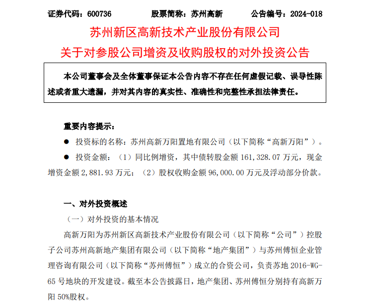 苏州高新(600736)7月12日晚间披露对外投资公告,公司拟向参股公司苏州高新万阳置地有限公司(以下简称“高新万阳”)增资,并收购苏州傅恒企业管理咨询有限公司(以下简称“苏州傅恒”)持有的高新万阳50%股权。高新万阳主要负责“苏地2016-WG-65号”地块的开发建设。