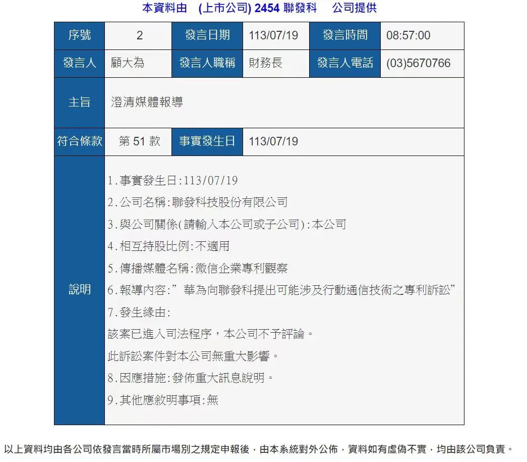 对此,7月19日,联发科发布公告回应媒体报道称,该案已进入司法程序,公司不予评论,此诉讼案件对公司无重大影响。截至目前,华为尚未回应此事。