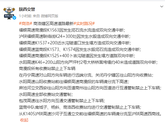 受连日降雨影响,商洛辖区多条道路中断、实行交通管制。具体路段信息如下: