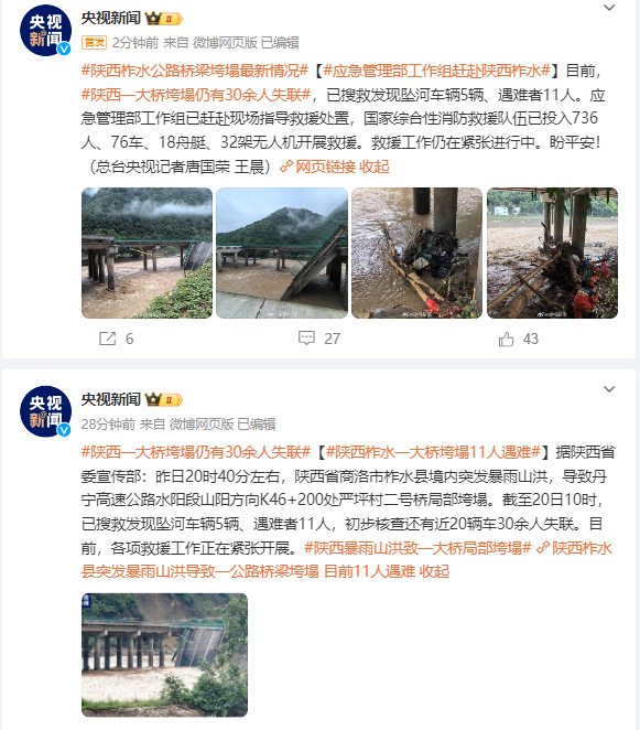 据新华社、央视报道,记者20日上午从陕西省委宣传部获悉,19日20时40分左右,陕西省商洛市柞水县境内突发暴雨山洪,导致丹宁高速公路水阳段山阳方向K46+200处严坪村二号桥局部垮塌。