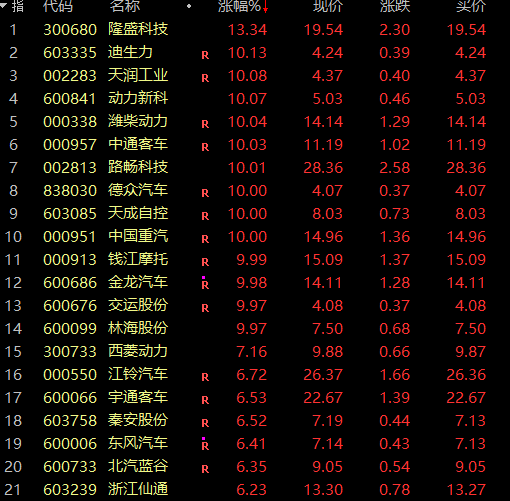 汽车行业全产业链也全线爆发,汽车拆解、汽车热管理、一体压铸、汽车整车等细分板块大幅走强。金龙汽车、钱江摩托、中国重汽、潍柴动力等批量涨停。