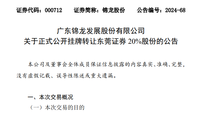此次交易此前早有预期。今年1月18日,锦龙股份召开了第九届董事会第三十一次(临时)会议,公司董事会同意就拟转让东莞证券股份在上海联合产权交易所预挂牌。1月19日,上海联合产权交易所发布了《东莞证券部分股份转让项目》公告。