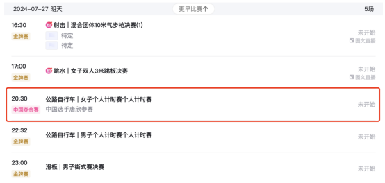 在7月27日的比赛中,共有7场金牌赛事。分别来自射击、跳水、公路自行车(男子、女子)、柔道、滑板等项目。其中20点30分举行的公路自行车女子个人计时赛中,中国选手唐欣将参赛。