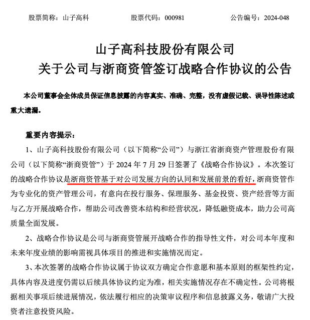 7月29日晚间,山子高科公告,公司2024年7月28日向浙商资管发出帮扶函,申请不超过10亿资金的融资支持,双方经过沟通和交流,于2024年7月29日签署了《战略合作协议》。