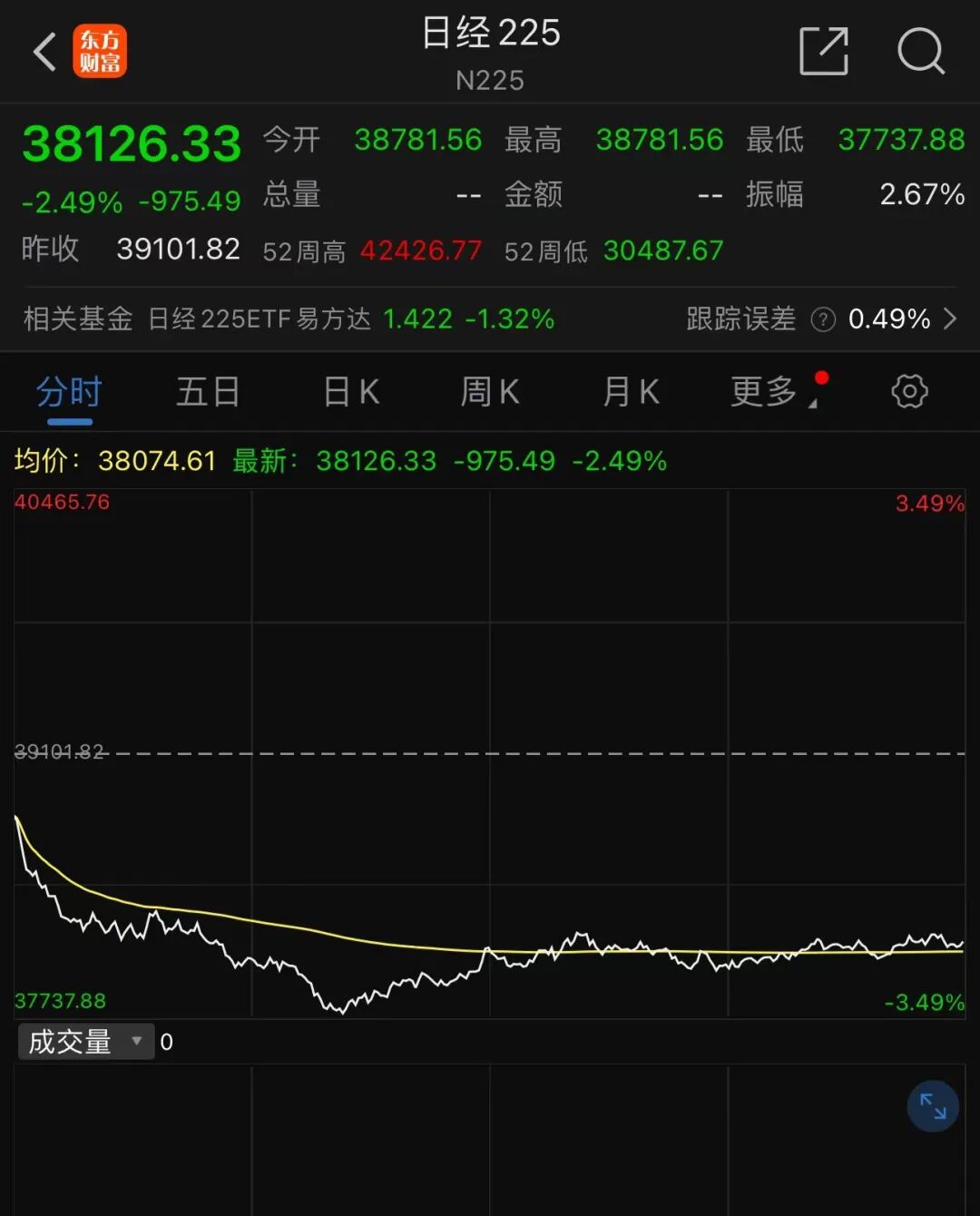 日本宣布加息后,外汇市场巨震,股市暴跌,日经225指数今天重挫近1000点,跌幅为2.49%。