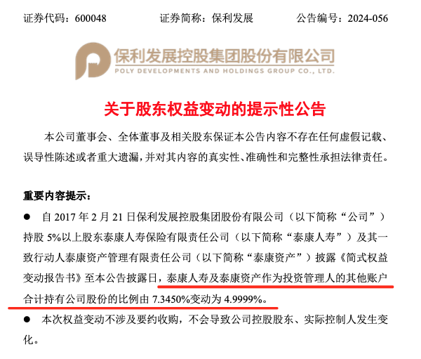 公告显示,自 2017 年 2 月 21 日泰康人寿及其一致行动人披露《简式权益变动报告书》至今,泰康人寿及泰康资产作为投资管理人的其他账户合计持有公司股份的比例由 7.35%变动为 4.99%,不再是保利发展持股 5%以上的股东,持股数量降至5.99亿股。