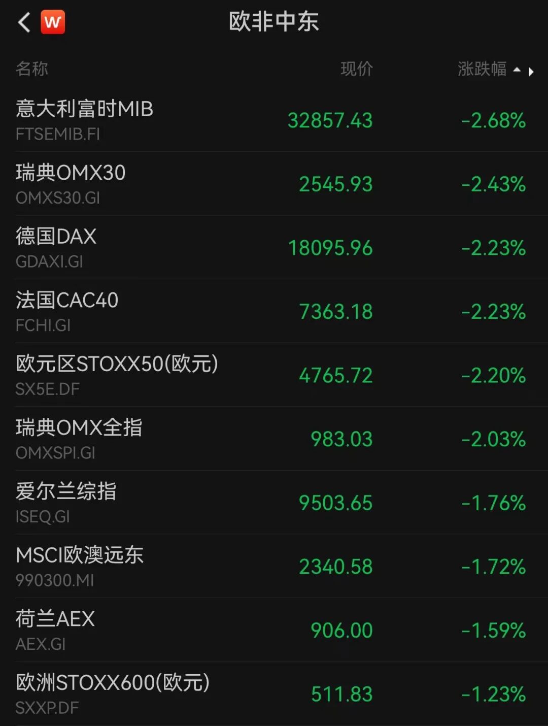 截至发稿,欧洲股市普遍下跌,德国DAX指数、法国CAC40指数、意大利富时MIB、瑞典OMX30等指数均大跌超2%。