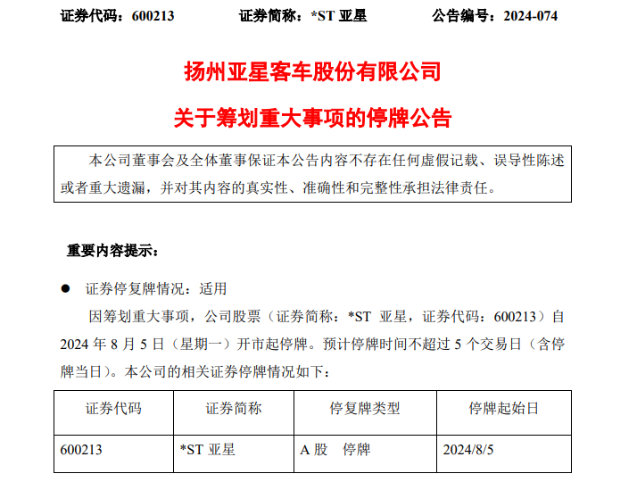 此番,*ST亚星表示,公司承诺将尽快推进上述重大事项的沟通论证及工作安排,预计于股票停牌时间不超过5个交易日(含停牌当日)后披露相关公告并复牌。公司提示称,上述终止上市仍处于筹划阶段,尚需提交公司董事会、独立董事专门会议、股东大会审议,并取得相关国有资产监督管理机构审核批准、上交所批准,最终能否通过前述相关审批及实施尚存在不确定性。