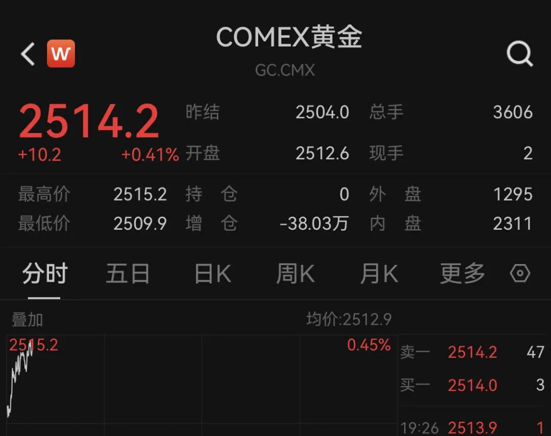 随着中东紧张局势升温,黄金连续上涨。COMEX黄金已涨2514.1美元/盎司。