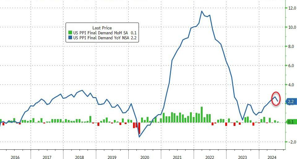 当地时间8月13日,美国劳工统计局公布数据显示,美国7月PPI同比上涨2.2%,低于预期2.3%和前值2.6%,环比涨幅为0.1%,前值和预期均为0.2%。7月核心PPI同比2.4%,低于预期2.6%和前值3%;环比持平,这是四个月来最温和的涨幅,好于预期的0.2%,前值从0.4%下修至0.3%。其中,服务业成本7月环比下降0.2%,为年内首次出现下降,且创造了2023年3月以来的最大降幅。
