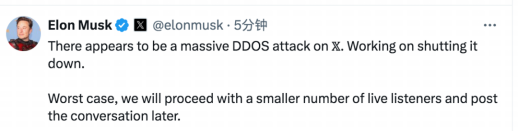 马斯克当时表示:“X似乎遭到了大规模的DDoS网络攻击,我们正在努力阻止它。最坏的情况下,我们将在只有少量现场听众的情况下继续与特朗普的访谈,并在稍后发布对话内容。”