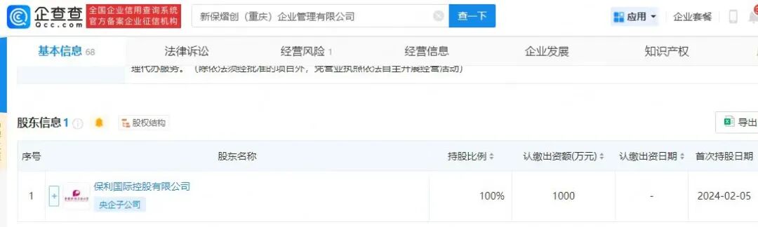 据企查查,新保熠创成立于2024年2月5日,注册资本为1000万元;从工商信息来看,新保熠创系保利国际全资子公司。