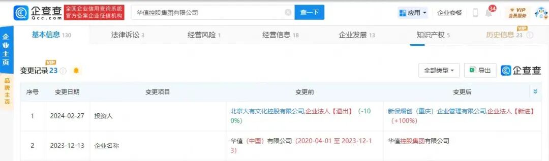 华值控股原由北京大有文化控股有限公司100%持股。今年2月27日,华值控股的全资股东变更为了新保熠创。