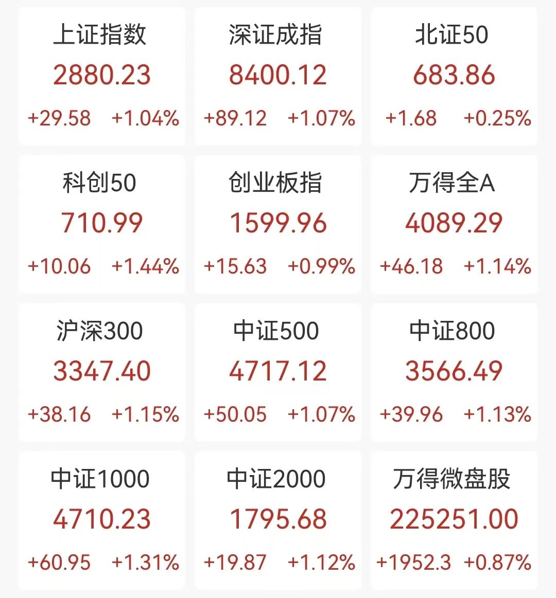 8月15日,A股一改前几日低迷状态,低开后持续走高。上证指数涨1.04%,报2880.23点;深证成指涨1.07%,报8400.12点;创业板指涨0.99%,报1599.96点。