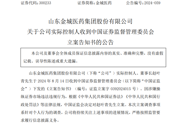金城医药(300233)8月16日晚间公告,公司实际控制人、董事长赵叶青于8月14日收到中国证监会下发的《立案告知书》。因涉嫌操纵证券市场违法违规行为,中国证监会决定对赵叶青立案。