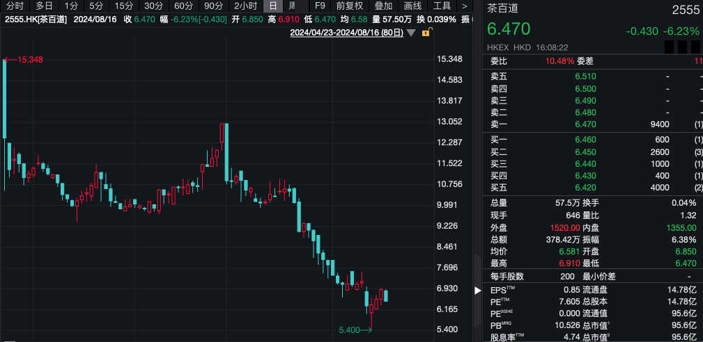 在发布盈利预警后的8月12日,茶百道股价一度跌至5.40港元/股,创上市以来新低。此后几个交易日股价有所反弹,截至8月16日最新收盘,最新报收6.47港元/股。