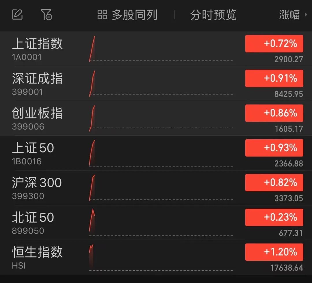 截至发稿,上证指数、深成指、创业板指、恒生指数等重要指数迅速拉升。其中,恒生指数涨超1%。