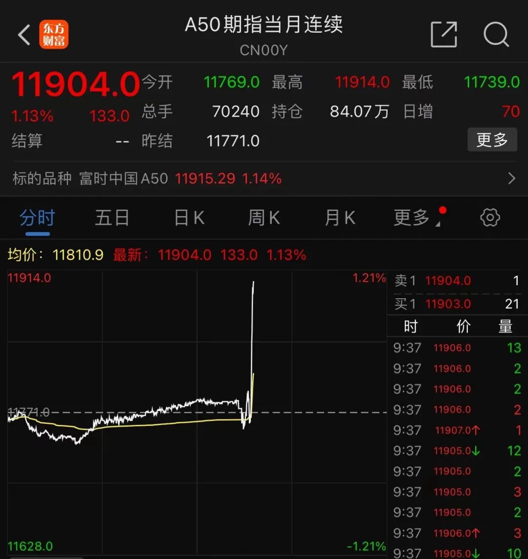 A50期货指数直线拉升,截至发稿,报涨1.13%。