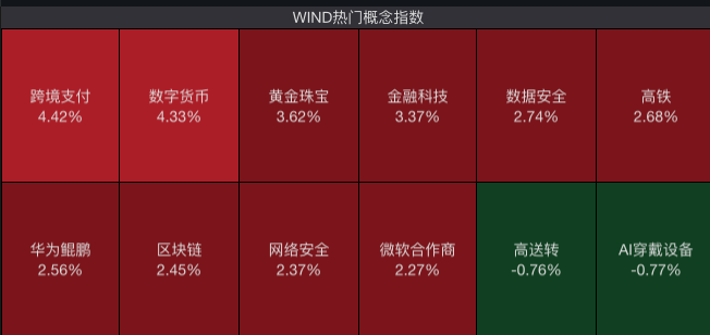 个股方面,跨境支付概念开盘走强,截至发稿,京北方、四方精创涨停,华峰超纤涨超11%,高伟达、易点天下、仁东控股等涨幅居前。