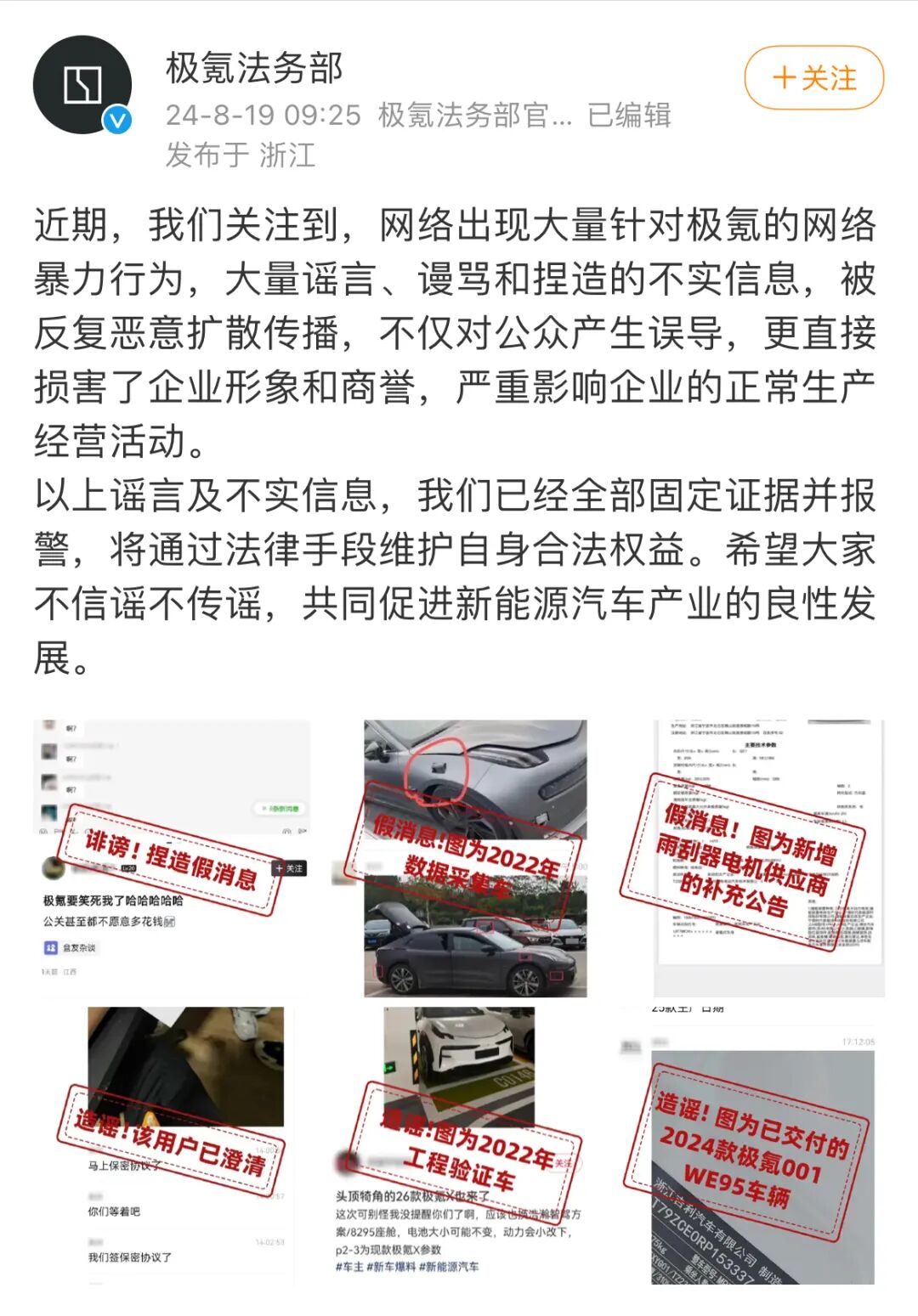 8月19日,极氪法务部通过微博发布信息称:“近期,我们关注到,网络出现大量针对极氪的网络暴力行为,大量谣言、谩骂和捏造的不实信息,被反复恶意扩散传播,不仅对公众产生误导,更直接损害了企业形象和商誉,严重影响企业的正常生产经营活动。”