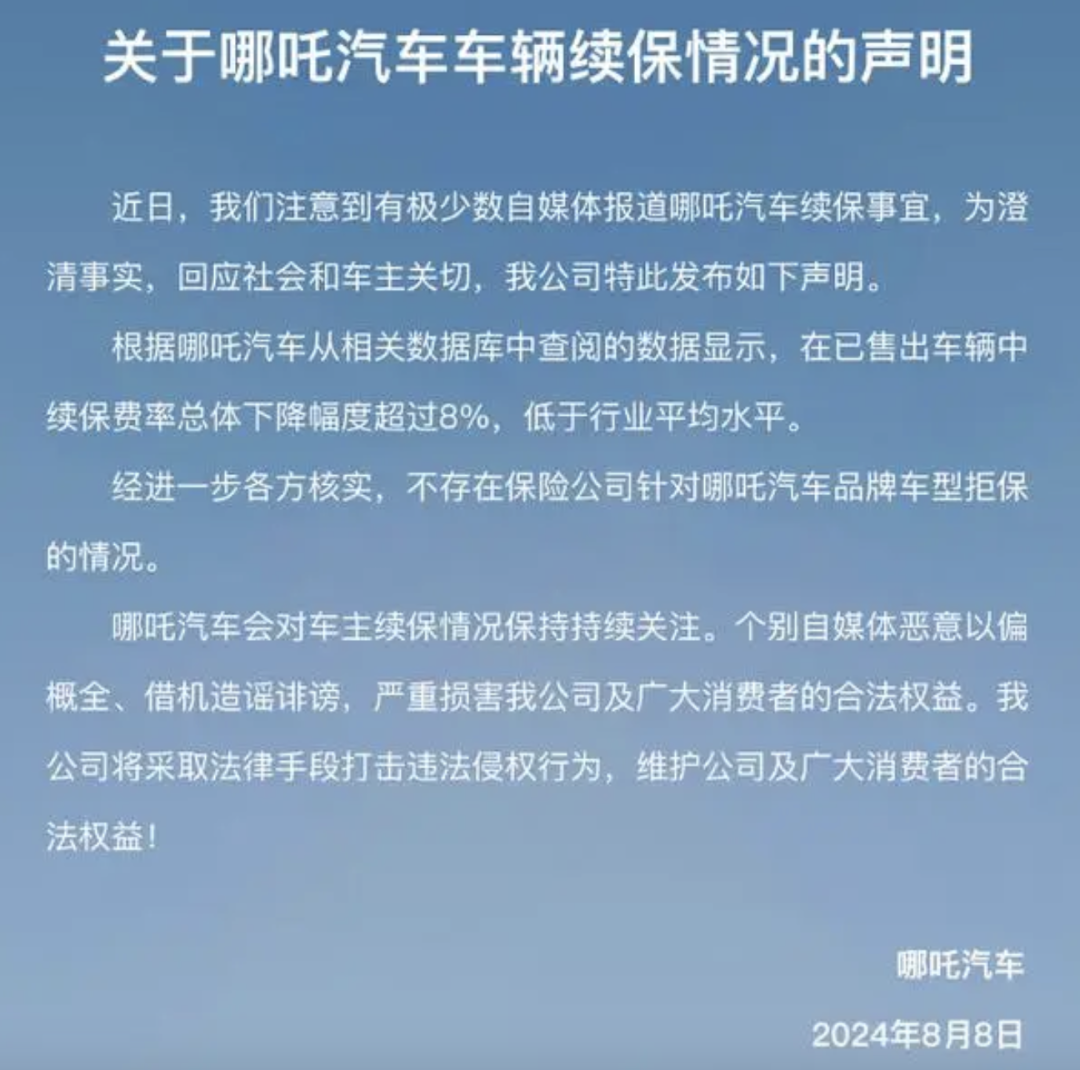 对此,哪吒汽车也通过官方声明进行澄清,表示不存在保险公司针对哪吒汽车品牌车型拒保的情况。个别自媒体恶意以偏概全、借机造谣诽谤。哪吒汽车将采取法律手段打击违法侵权行为,维护公司及广大消费者合法权益。