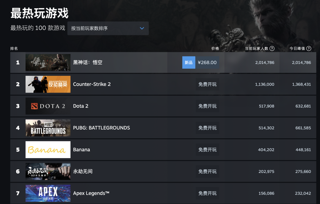 目前,《黑神话:悟空》已经创下同时在线玩家最多的付费买断制单机游戏纪录,其同时在线人数已经在Steam平台中,也已经仅次于《PUBG: Battlegrounds》和《Palword》,两者峰值纪录分别为325.7万和210万。