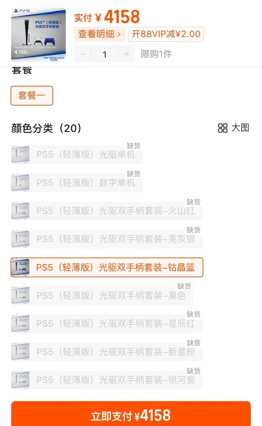 而在某电商平台的索尼PlayStation官方旗舰店,记者发现目前仅有一个颜色的PS5还有货,其他颜色基本售罄,且价格也高达4158元。