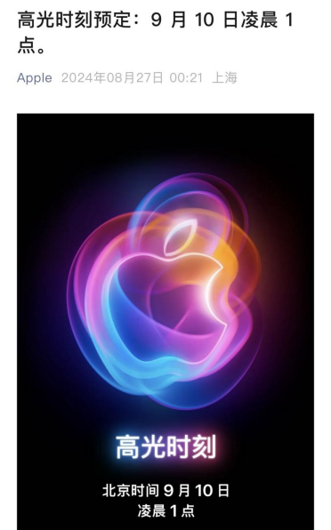 8月27日凌晨零点21分,Apple微信公众号推送了一则发布会通知,标题为:《高光时刻预定:9月10日凌晨1点》。