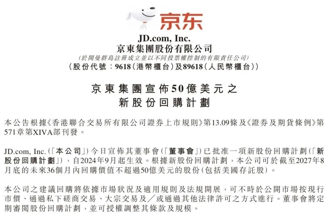 据京东8月27日公告,其董事会已批准一项新股份回购计划自2024年9月起生效。根据新股份回购计划,公司可于截至2027年8月底的未来36个月内回购价值不超过50亿美元的股份(包括美国存托股)。