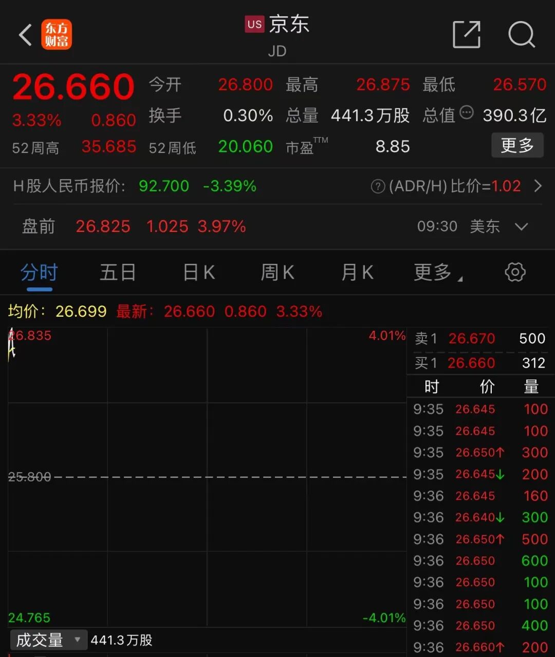 8月27日,京东美股盘前直线拉涨,开盘直接高开。截至发稿,涨幅为3.33%。