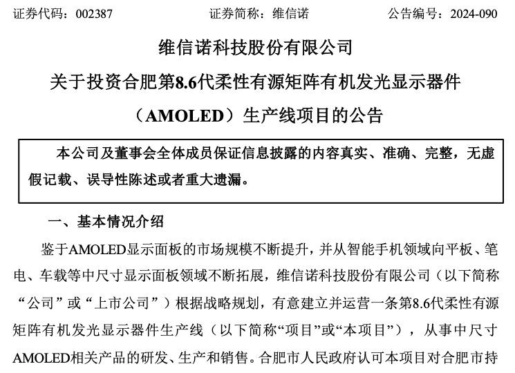 此前,今年5月28日中午,维信诺曾公告,其与合肥市人民政府于5月28日就该项目达成合作意向并签署《合作备忘录》,约定双方拟在合肥市新站高新技术产业开发区合作投资建设及生产运营第8.6代柔性有源矩阵有机发光显示器件(AMOLED)生产线项目。