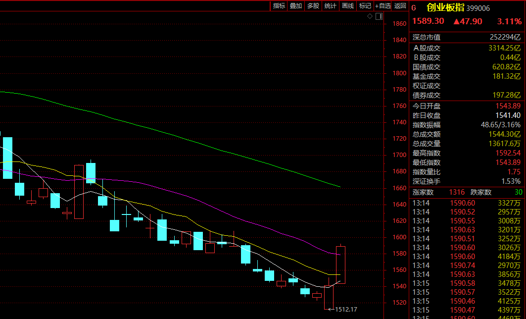 A股方面,午后上证指数、深证成指和创业板指继续上涨,其中创业板指涨幅超3%。