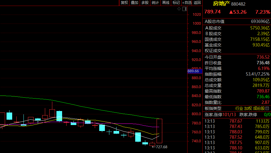 A股房地产板块则大涨逾7%。新城控股、中交地产、滨江集团、世联行等十余股涨停,另外保利发展、招商蛇口双双涨超9%