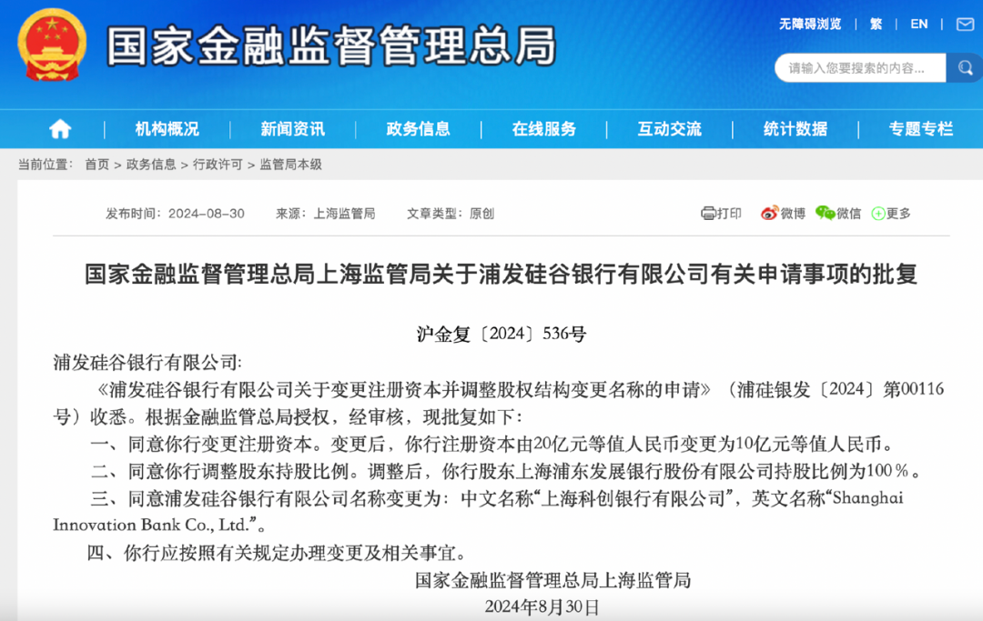 国家金融监督管理总局上海监管局8月30日批复信息显示,《浦发硅谷银行有限公司关于变更注册资本并调整股权结构变更名称的申请》(浦硅银发〔2024〕第00116号)已获监管收悉。