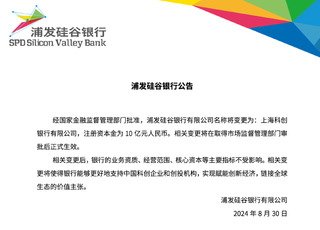 在监管行政许可信息披露当日,浦发硅谷银行也公告称,经国家金融监督管理部门批准,浦发硅谷银行有限公司名称将变更为:上海科创银行有限公司,注册资本金为10亿元人民币。相关变更将在取得市场监督管理部门审批后正式生效。