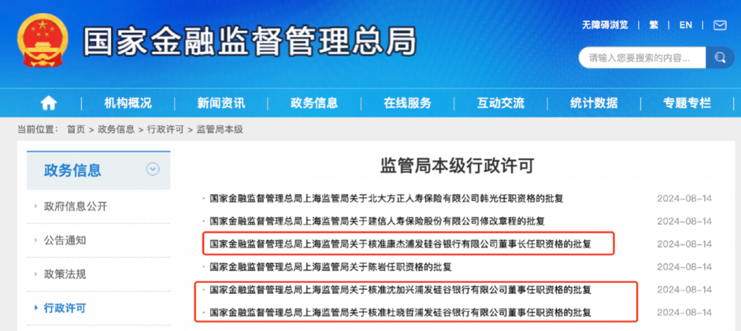 就在刚刚过去的8月份,国家金融监督管理总局上海监管局核准了康杰浦发硅谷银行有限公司董事长任职资格。同时,沈加兴、杜晓哲浦发硅谷银行有限公司董事的任职资格也获得监管核准。