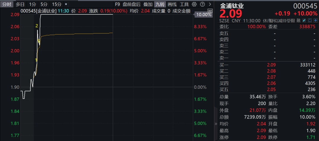 钛金属概念早间同样放量高开高走,板块指数一度大涨逾2%。金浦钛业开盘后仅约10分就直线涨停,股价创3个月来新高;惠云钛业、坤彩科技、宝钛股份等涨幅居前。