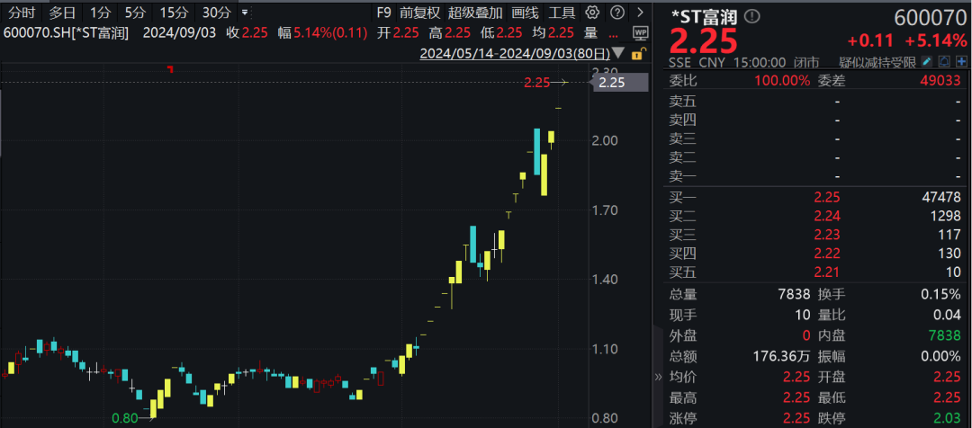 在今年6月、7月多次出现股价连续多日低于1元/股的*ST富润(600070),自7月底以来,走出“开挂”行情:7月24日至9月3日的30个交易日里,走出了22个涨停板。9月3日晚间,该公司股价已收于2.25元/股。